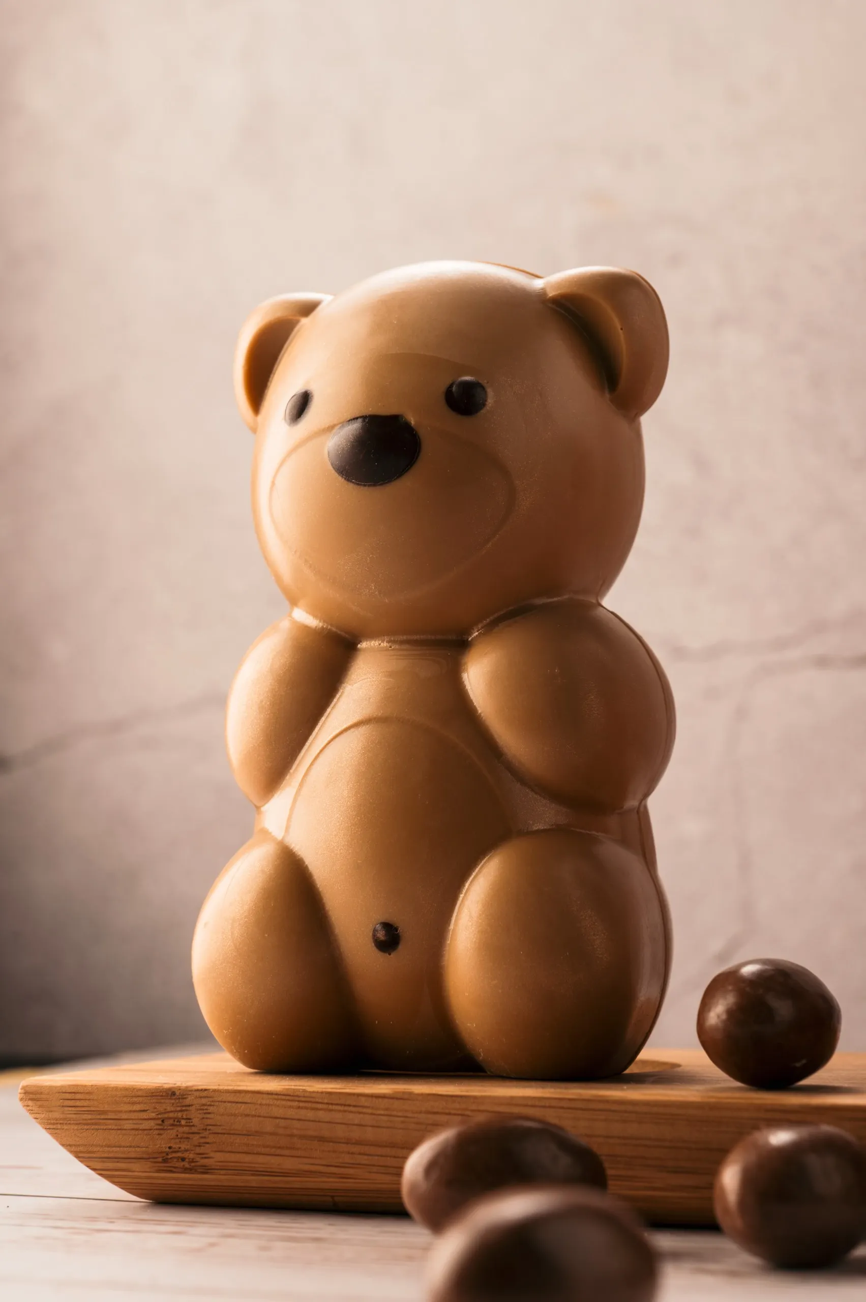 Comprar este oso de chocolate dorado significa elegir el más llamativo y original de la colección. Su sofisticada figura de chocolate rubio Dulcey con un relleno sorpresa de mini bombones gourmet lo convierte en el detalle ideal para:
